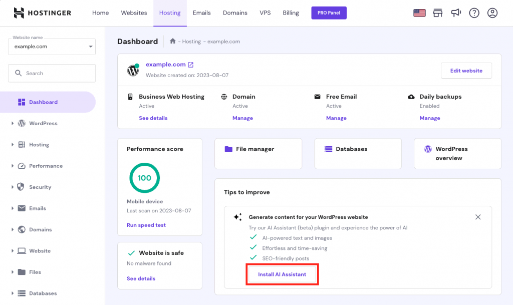 Also, you can install AI Assistant directly from hPanel’s Members Area. Head to your WordPress website management dashboard, and you will see the option under the Tips to Improve section.