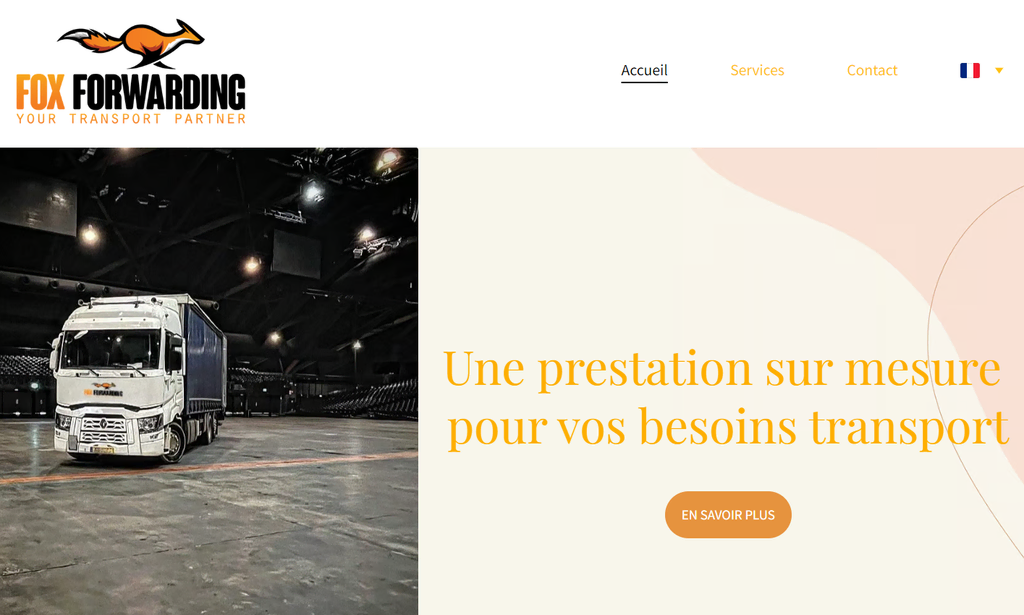 Le site de Fox Forwarding offre efficacité et convivialité à son public cible. Sur la page d’accueil, vous trouverez un écran partagé et un appel à l’action. Le menu de navigation simplifie votre parcours en vous permettant d’accéder facilement aux pages Accueil, Services et Contact.