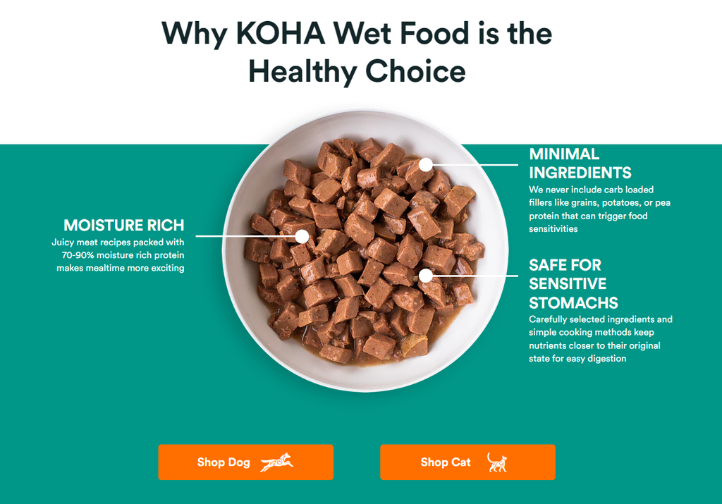 Si vous êtes particulièrement intéressé par les exemples de sites web e-commerce StoryBrand, vous voudrez peut-être consulter Koha Pet. Le problème que cette marque présente est que certains animaux ne prospèrent pas avec des régimes uniquement à base de nourriture sèche. Koha Pet promet de résoudre cela en offrant une nourriture humide saine qu’ils vont adorer.