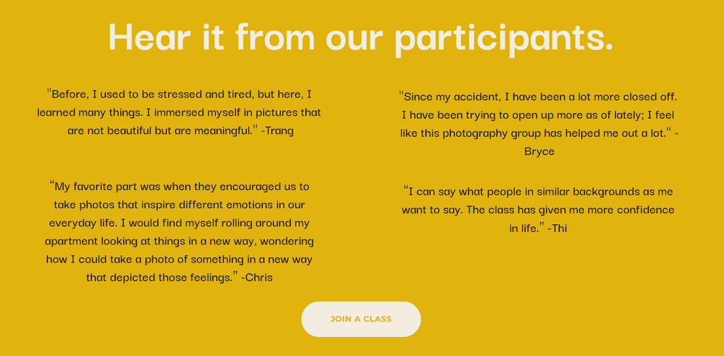 Le site web de New Lens offre une navigation conviviale. Le contenu de la page d’accueil explique clairement le programme et présente des galeries de photos. Chaque page du site mène à la page “Get Involved”, qui encourage les visiteurs à rejoindre le programme.