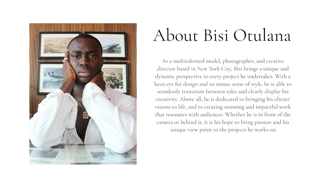 La page d’accueil présente quatre exemples de photographies éditoriales de styles différents, donnant aux visiteurs un aperçu rapide du travail d’Otulana. Il est intéressant de noter que le site web combine la page d’accueil et la section “À propos”. Les lecteurs peuvent en savoir plus sur Otulana sans avoir à naviguer sur une nouvelle page.