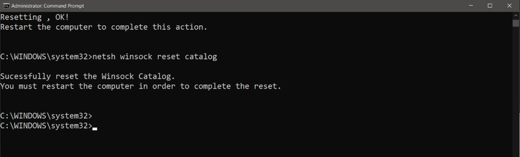 Also, use netsh to reset Winsock – a Windows programming interface responsible for establishing a network connection. It may become corrupted, causing connectivity errors.