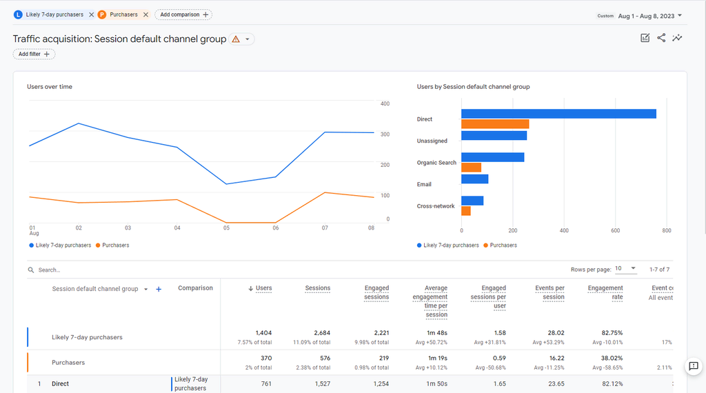 Your comparison settings will stay active across different Report sections until you deactivate them. For instance, switch to the Traffic acquisition page to observe channel popularity among the user groups.