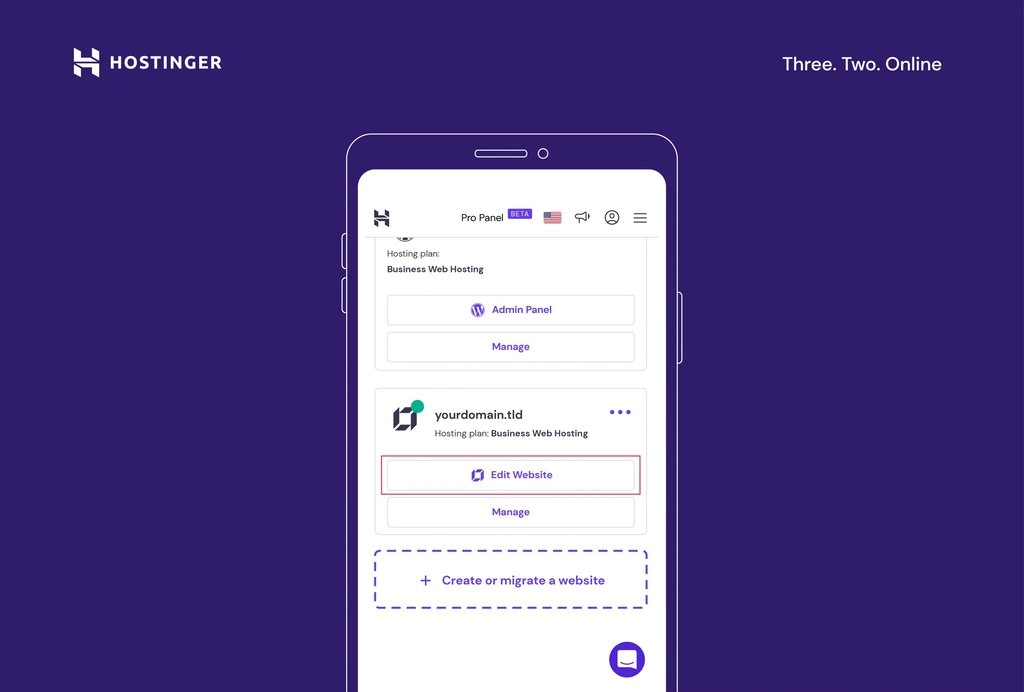 Log in to hPanel, select the website you want to edit, or choose to create a new one with Hostinger Website Builder. You can edit your website directly from the browser on various mobile devices.
