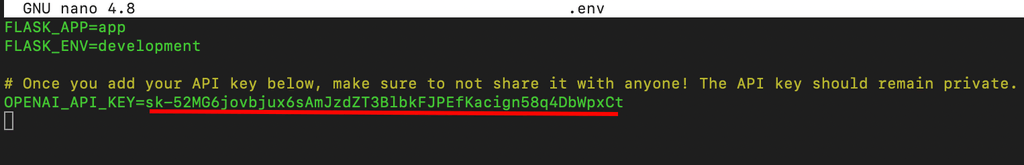 4. Open the .env file with your favorite text editor and add your secret key to the OPENAI_API_KEY line. We are using nano:
