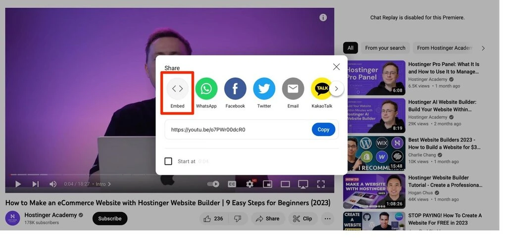 - Copy the YouTube iFrame code that appears. You can also define iFrame parameters like the height and width of the content.