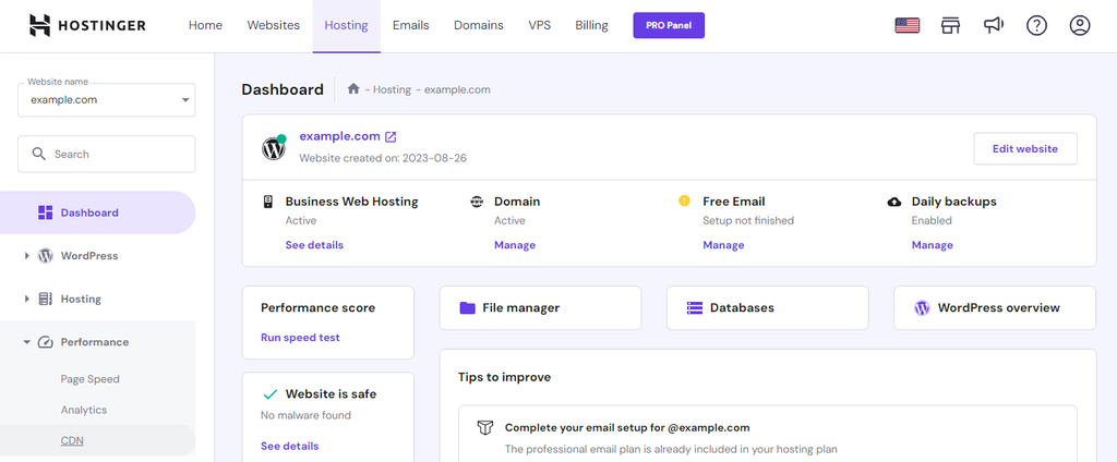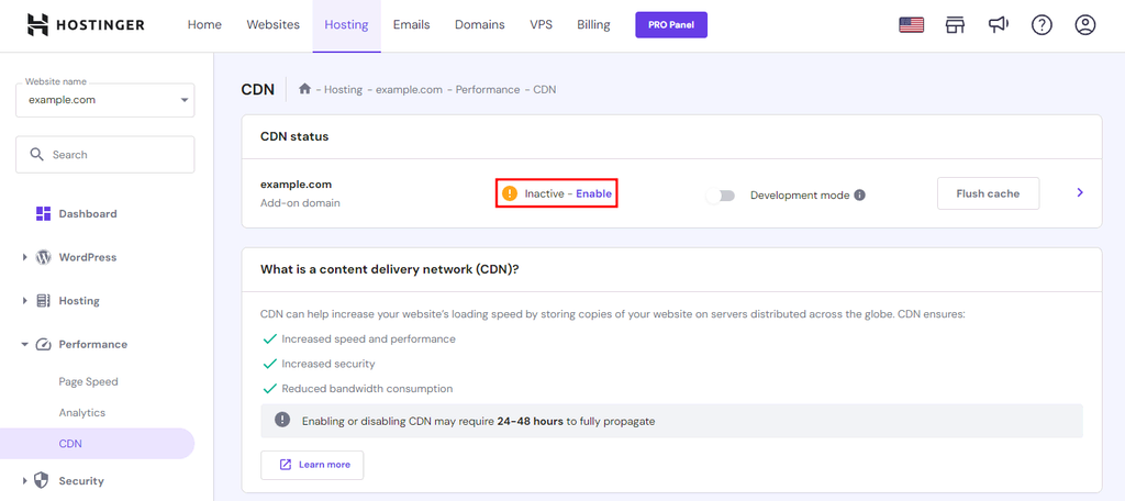 Open hPanel, select your website, and navigate to the Performance → CDN section: