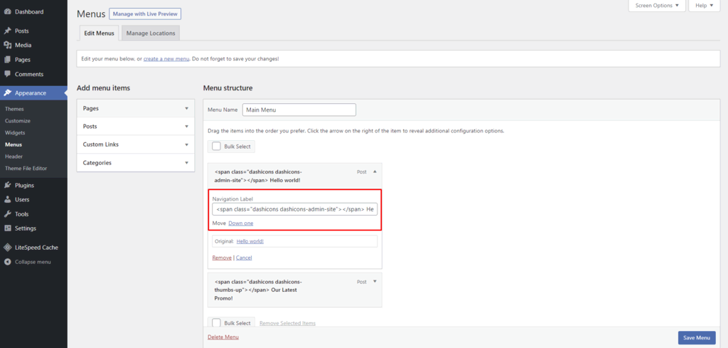 1. Go to Appearance Menus from your WordPress dashboard. Click on the menu item to expand the dropdown menu and paste the HTML code into the Navigation Label textbox before the text.