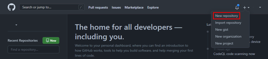 - Click the + icon on the top right of the page. From the drop-down menu, select New repository.