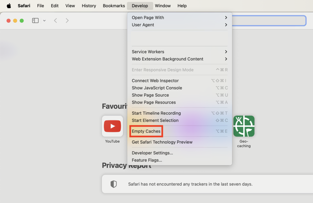 - Click on the Develop tab on the Safari menu bar at the top of the screen and select Empty Caches.