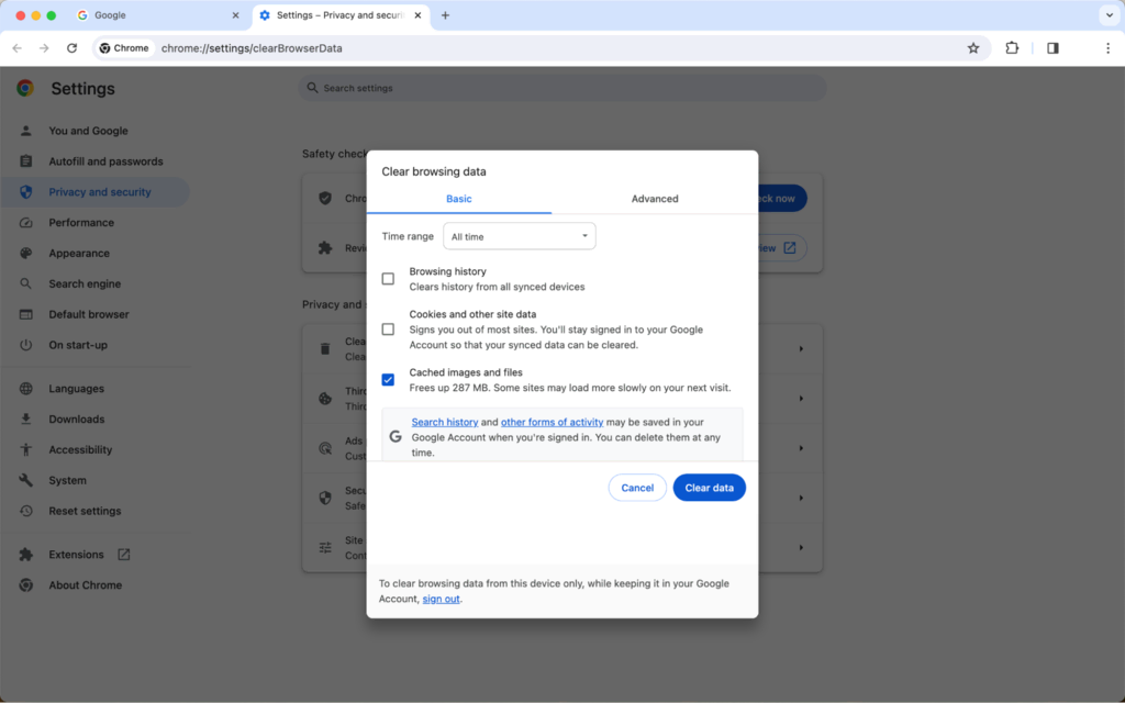 Every browser provides the option to clear cache and other site data in its settings or tools menu, but the ways to do so may differ slightly. Make sure to follow the correct steps according to the browser.