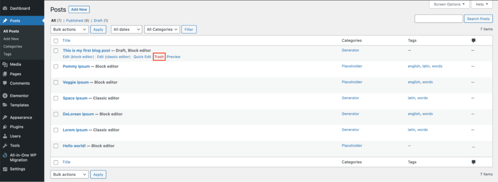 Another way is to go to Dashboard → Posts → All Posts, hover over a specific post, and click Trash.