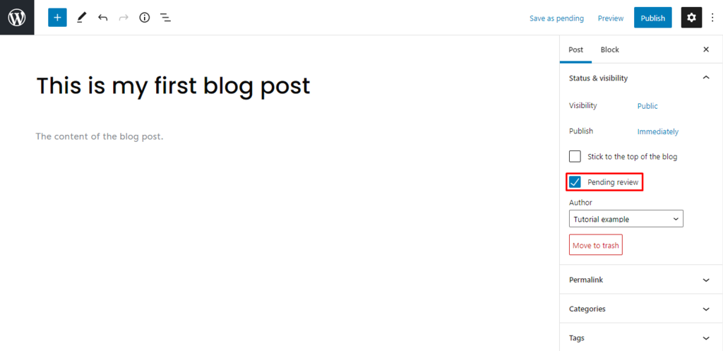 This feature tells other back-end WordPress users that the article is finished and needs to be reviewed before publishing. WordPress adds the Pending status next to your article by checking this setting.