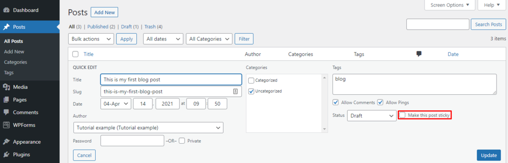 Another way to change the sticky post feature on an article is to go to Dashboard → Posts → All Posts. From there, click on Quick Edit under the article and tick the Make this post sticky option.