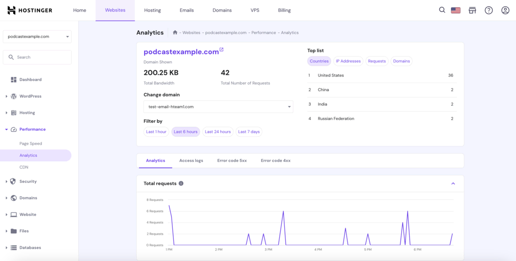 Hostinger also supports your SEO efforts through a specialized analytics section. This feature provides comprehensive podcast website analytics and insights to help you make data-driven decisions to improve your website optimization efforts.