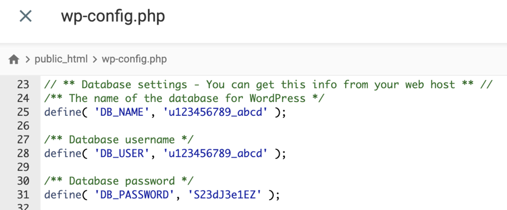 Hostinger users can do this by going to the hPanel’s File Manager public_html and then locating and opening the wp-config.php file.